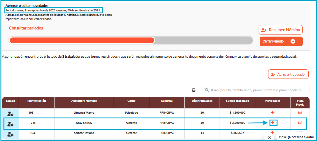 2. Validar que se encuentre el periodo correspondiente, ubicamos al trabajador en el cual deseamos registrar las novedad, seleccionamos la opción novedades "+".
