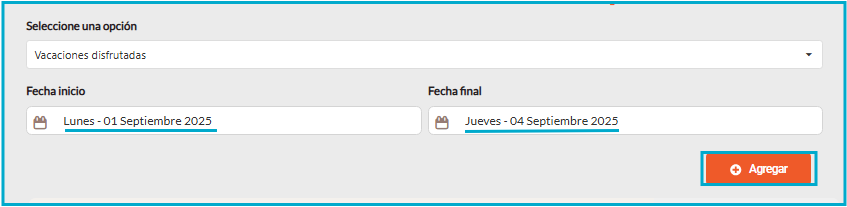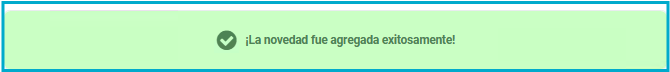 5. Una vez allí, agregamos la "Fecha inicial" y la "Fecha final" y "agregar", Después saldrá un aviso de "¡La novedad fue agregada exitosamente!".