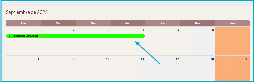 6. Saldrá un cuadro tipo calendario mostrando la novedad en dichas fechas.