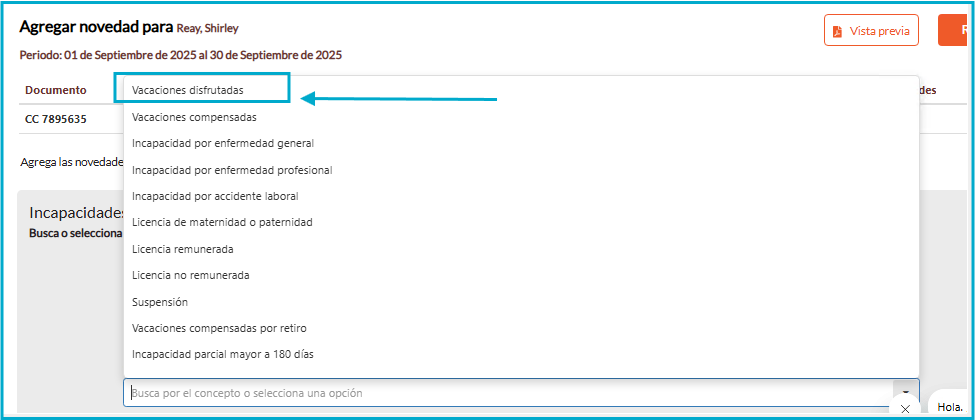 4. Buscamos el concepto "Vacaciones disfrutadas" y la seleccionamos.