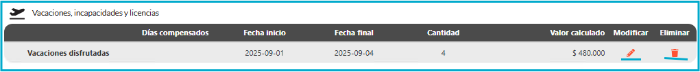 Adicional en la parte inferior el sistema nos muestra las novedades agregadas con el valor que se generó de forma automático, en este podrás modificar o eliminar la novedad.