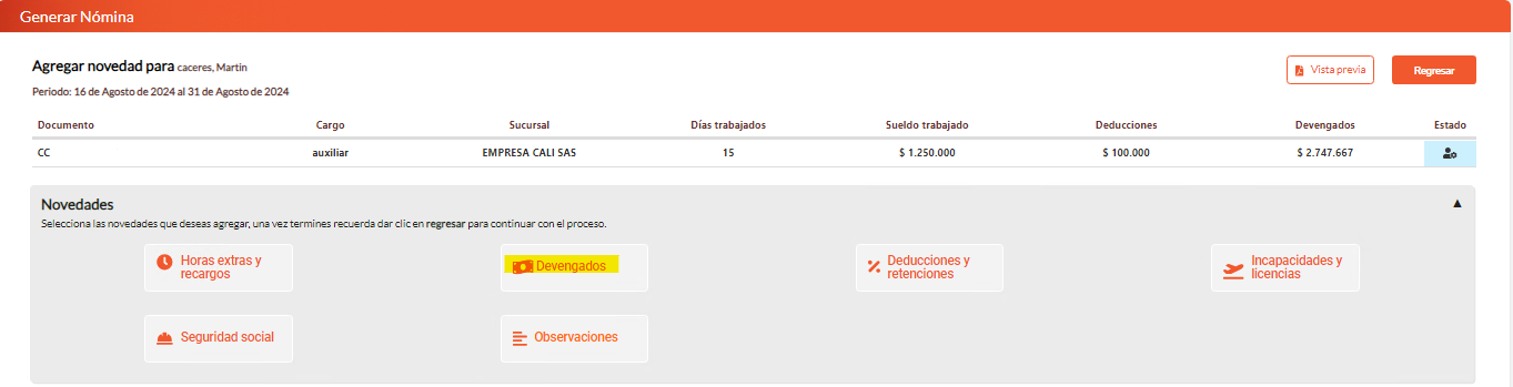 Después de ingresar ubicamos al trabajador y le damos clic en novedades «+» luego ingresamos por de «Devengados»: