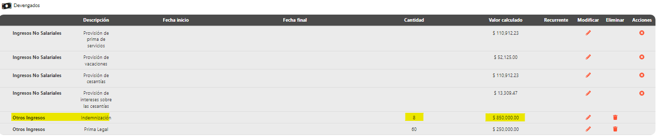 Una vez agregada la indemnización el sistema indica «Devengado ingresado con éxito». En la parte inferior aparece «Valor Pagado» y Cantidad de días».