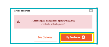 4. Saldrá letrero de "¿Estás seguro que deseas agregar el nuevo contrato al trabajador?" dar clic en "Si, Continuar".