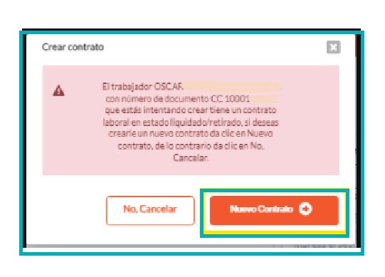 2. Al agregar el número de documento en el espacio, debe salir el siguiente anuncio "El trabajador... con número de documento CC 10001.... que estás intentando crear tiene un contrato laboral en estado liquidado/retirado, si deseas crearle un nuevo contrato da clic en Nuevo contrato, de lo contrario da clic en No, Cancelar" y se da clic en "Nuevo contrato".