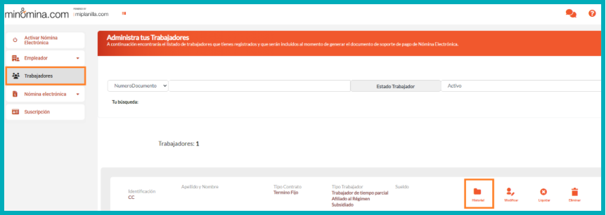 2. Dirígete al menú de la izquierda dar clic en opción Trabajadores, ubica tu trabajador de tiempo parcial, dar clic en opción Historial