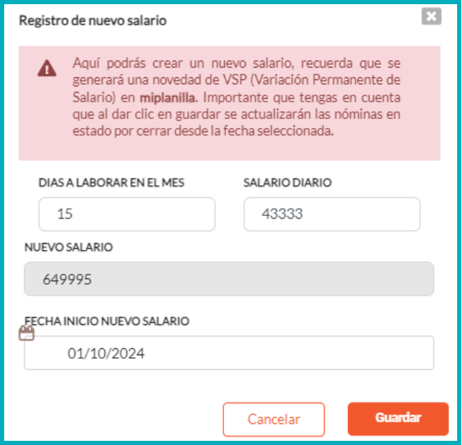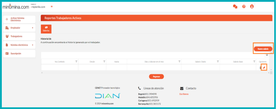 3. Podrás crear nuevo salario o editar si ya existe un registro