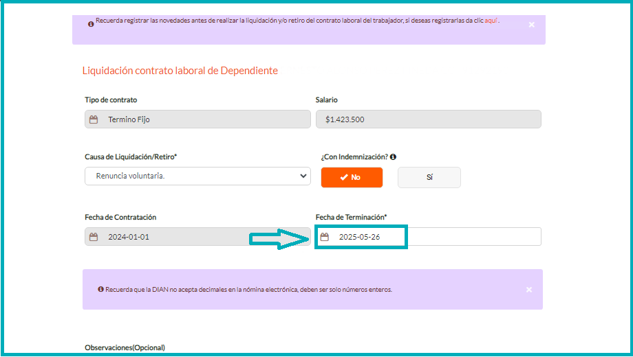 10. Una vez registre o elimine las novedades debe realizar de nuevo el proceso de liquidar el contrato ingresando causa y fecha de retiro.