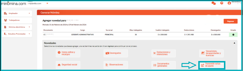 13.. Después puede revisar y visualizar la nota de ajuste transmitida en la opción - nóminas transmitidas.