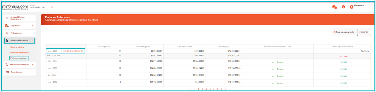 2. Para así ingresar y poder visualizar el menú principal del lado izquierdo de la pantalla. Vas a dar click en «Nómina electrónica» luego en «Periodos anteriores».