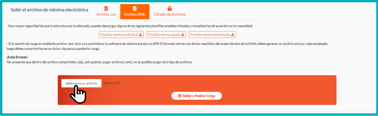 «¡Evade Errores!»: Ten en cuenta que dentro del archivo comprimido .zip solo cargarás archivos .xml y no será posible cargar otro tipo de archivo.
