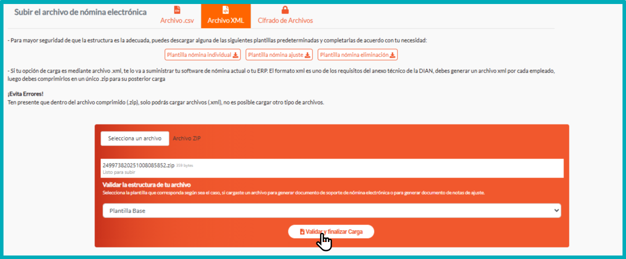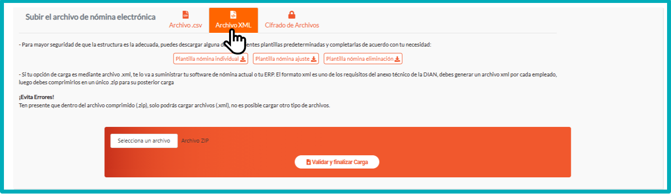 En el caso que tu opción de carga sea mediante archivo .xml te será suministrado por tu software de nómina actual o tu ERP - Enterprise Resource Planning ( Sistema de planificación de recursos empresariales). El formato XML es un requisito técnico de la DIAN; y debe ser general por cada empleado.