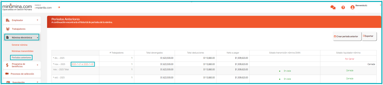 3. Una vez en periodos anteriores, dar clic sobre el periodo ya cerrado, de la siguiente manera;