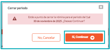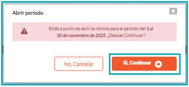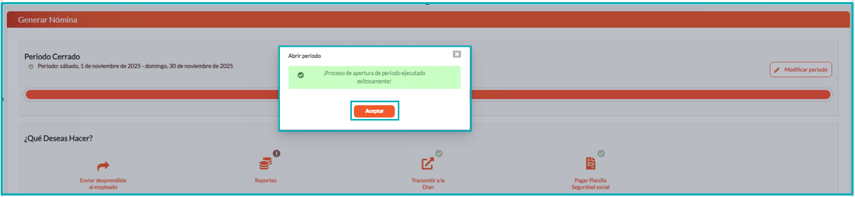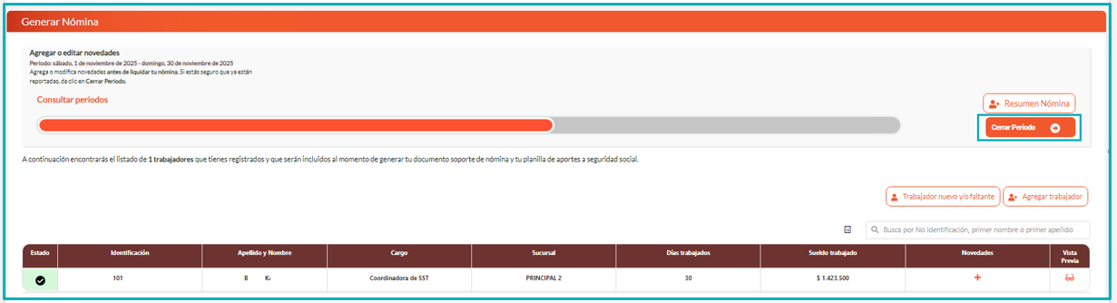 5. Una vez realizado el proceso, podrá ser modificada la información necesaria dentro de la nómina, y luego de realizar los cambios, podrá ser cerrado nuevamente el periodo.