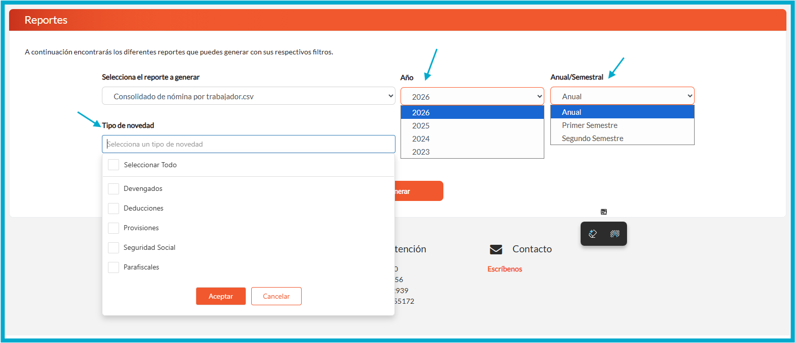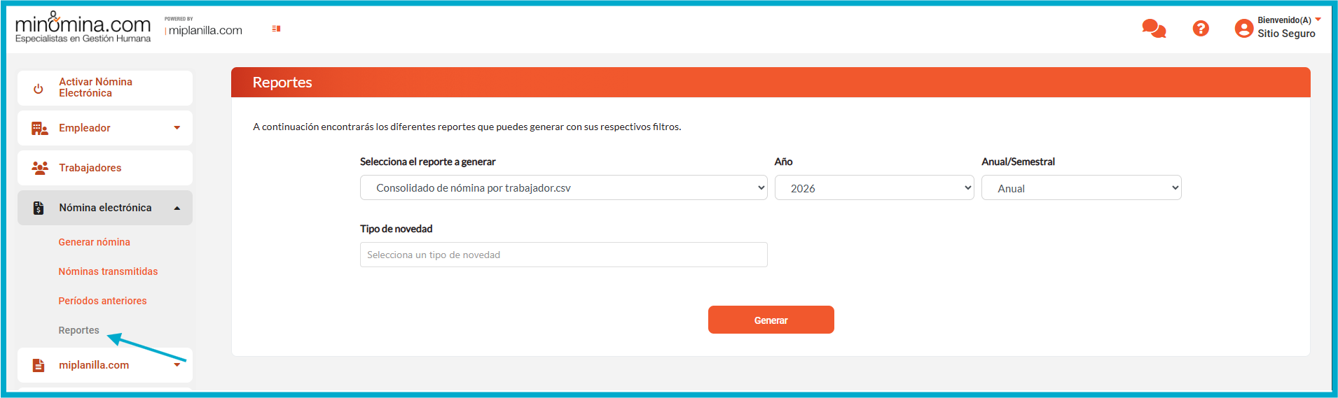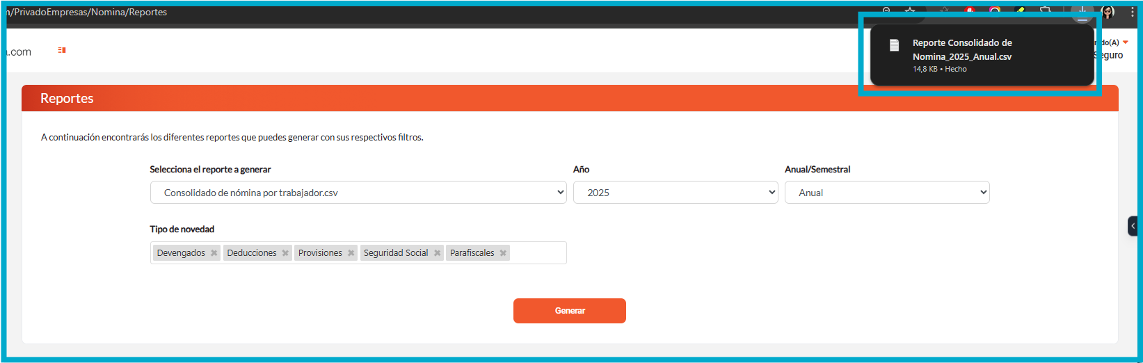 5. Seleccione el tipo de reporte a descargar, indique el año , la periodicidad tipo de novedad y finalmente haga clic en el botón “Generar”.