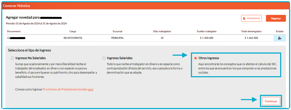 Selecciona «Otros Ingresos» y luego «Continuar».