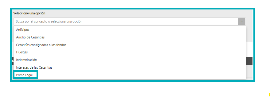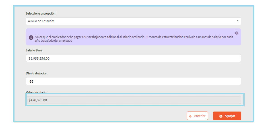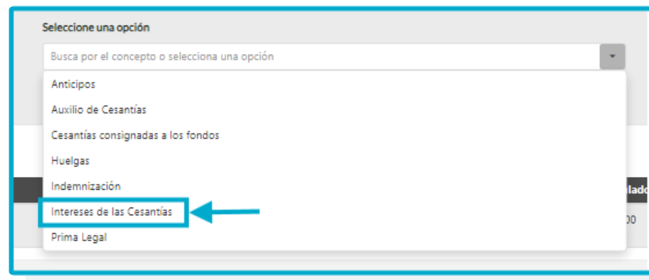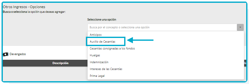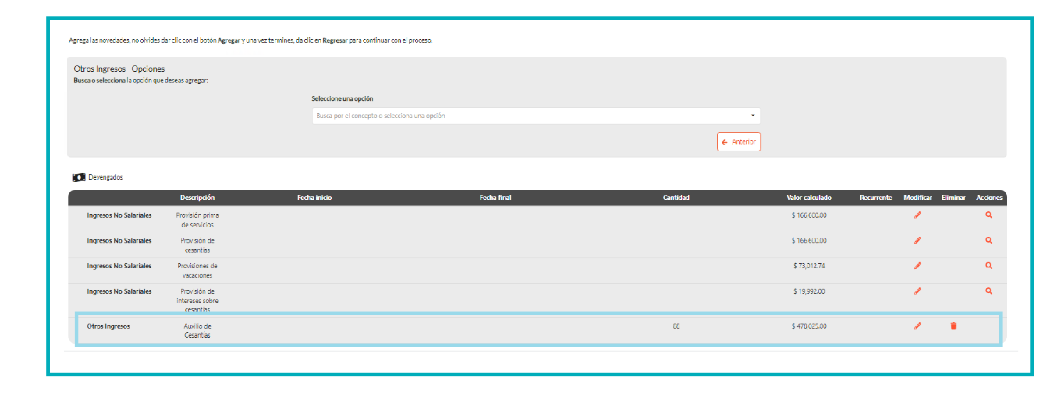 Selecciona el concepto que compete en este caso «Auxilio de Cesantías-INTESES DE LAS CESANTIAS Y PRIMA» y presiona «Agregar». Observa las próximas imágenes.
