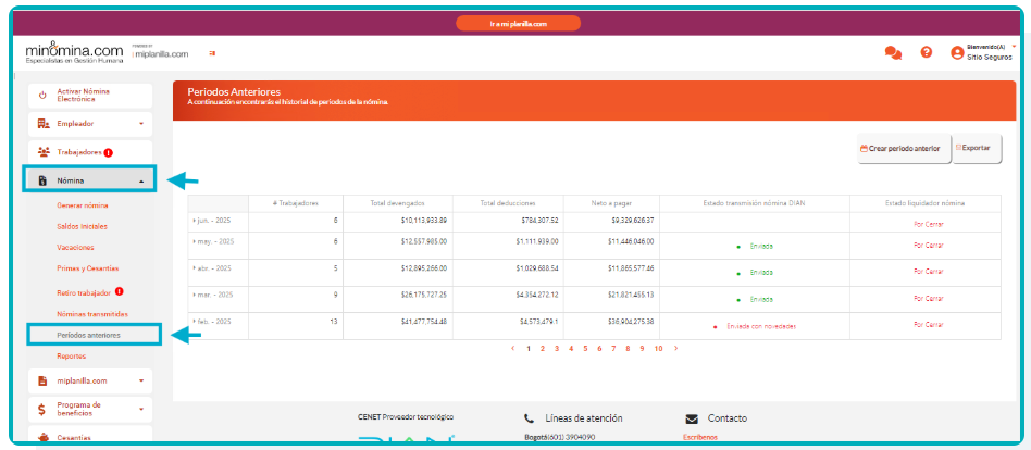 2.Ingresar a la opción de “Periodos anteriores” dando clic en “Nomina electrónica