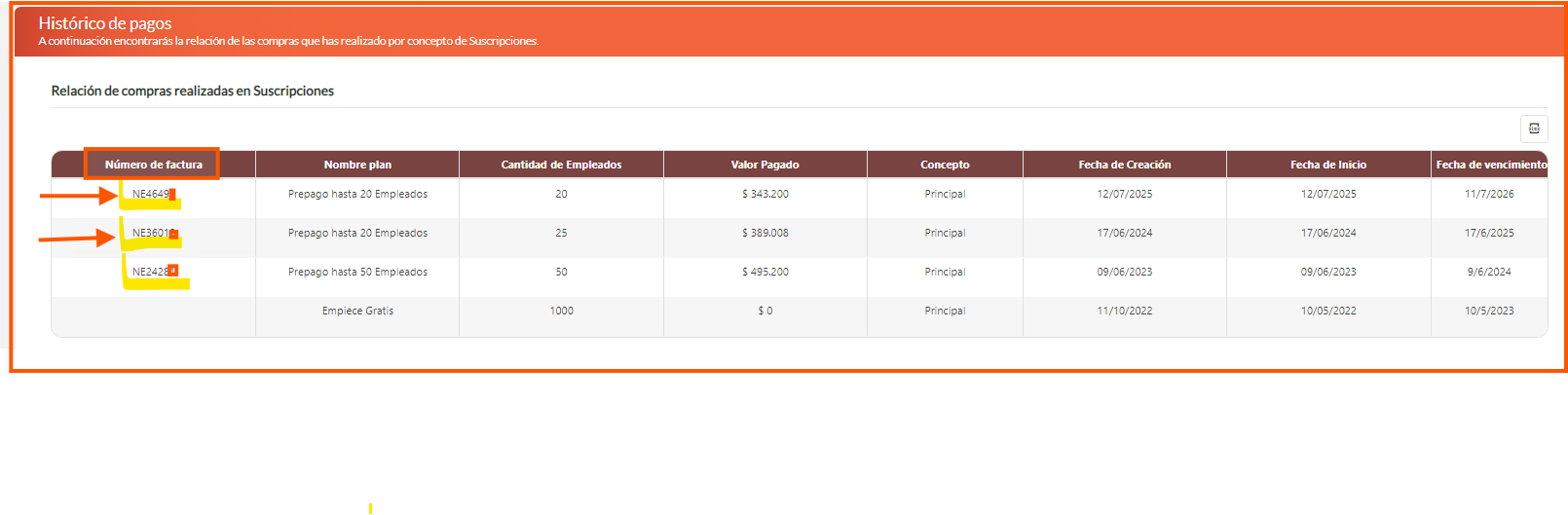 3. En Suscripción esta Histórico, al dar clic ahi en la primera columna encuentra el Numero de factura y la información respecto a todos los pagos de inscripción, renovación de planes en minomina y la adquisición de empleados adicionales.