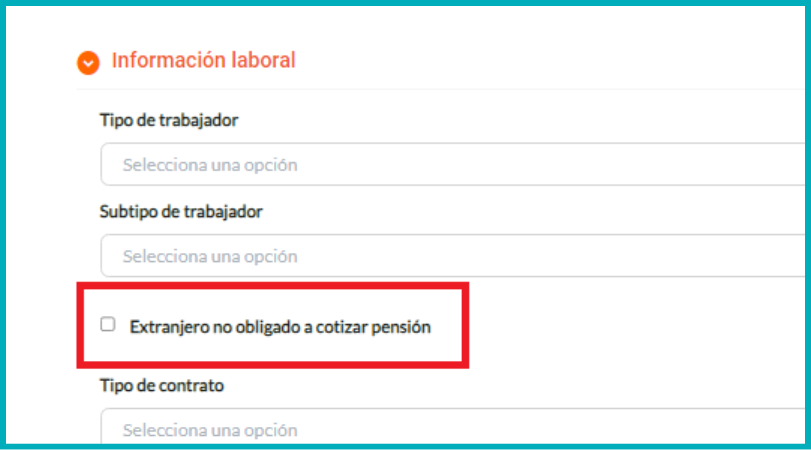 3. Al agregar al trabajador y colocarle un tipo de documento de extranjero, en la parte de información laboral, aparece la opción "extranjero no obligado a cotizar pensión" solo hay que marcar el check así el sistema identificará que no debe cotizar pensión y por lo tanto no le pedirá los datos de afiliación a pensión.