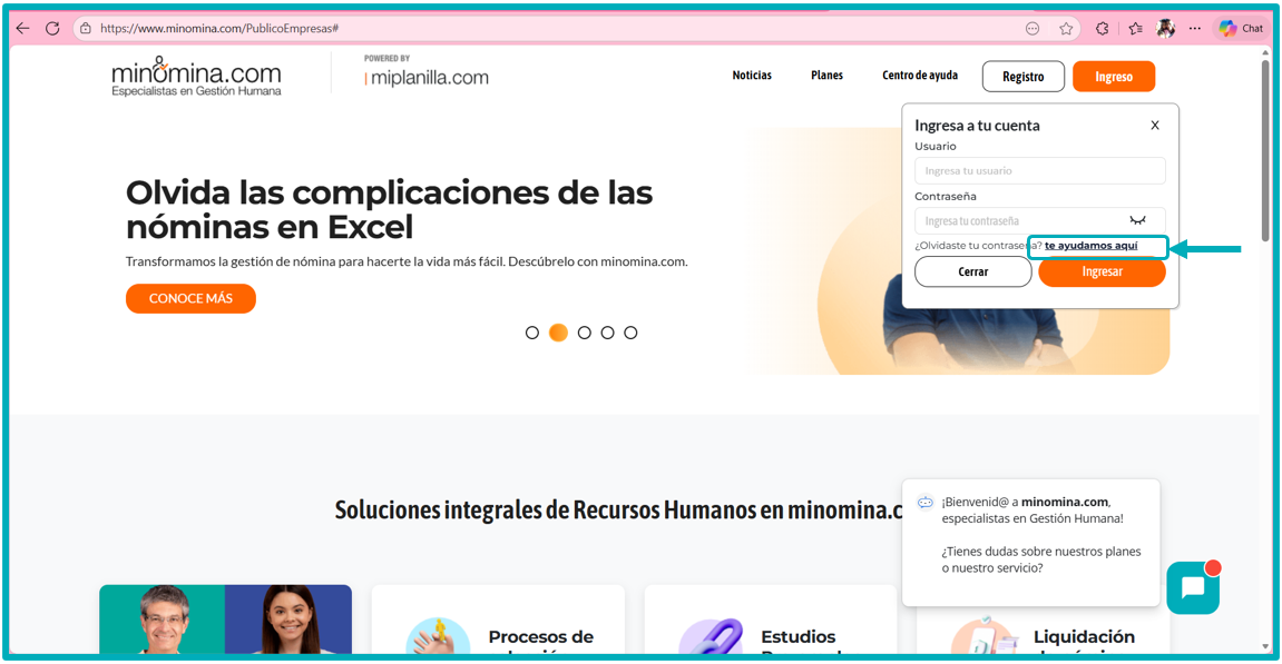 2. Luego le damos clic en: te ayudamos aquí y este nos lleva a otra página, que nos pide el usuario registrado.