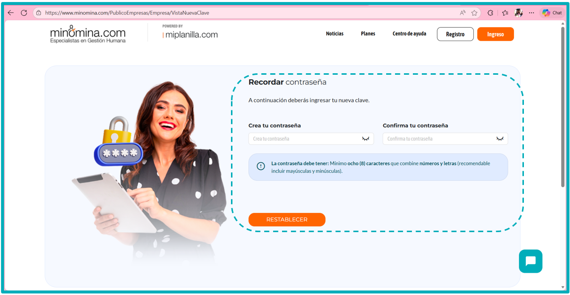 5. Una vez termines este proceso debes colocar la nueva contraseña, recuerda que esta debe estar compuesta por mayúsculas, minúsculas, números, y no debe llevar caracteres especiales.
